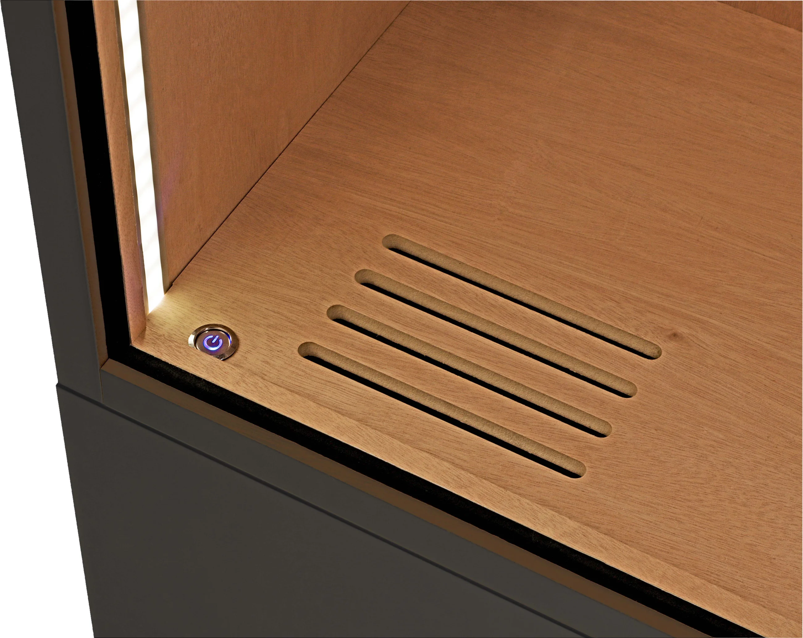 - Doskonałe nawilżanie sterowane mikroprocesorem i idealna cyrkulacja gwarantowana przez podwójną tylną ścianę. Wilgotność powietrza jest równomiernie rozprowadzana na różnych piętrach humidora.
