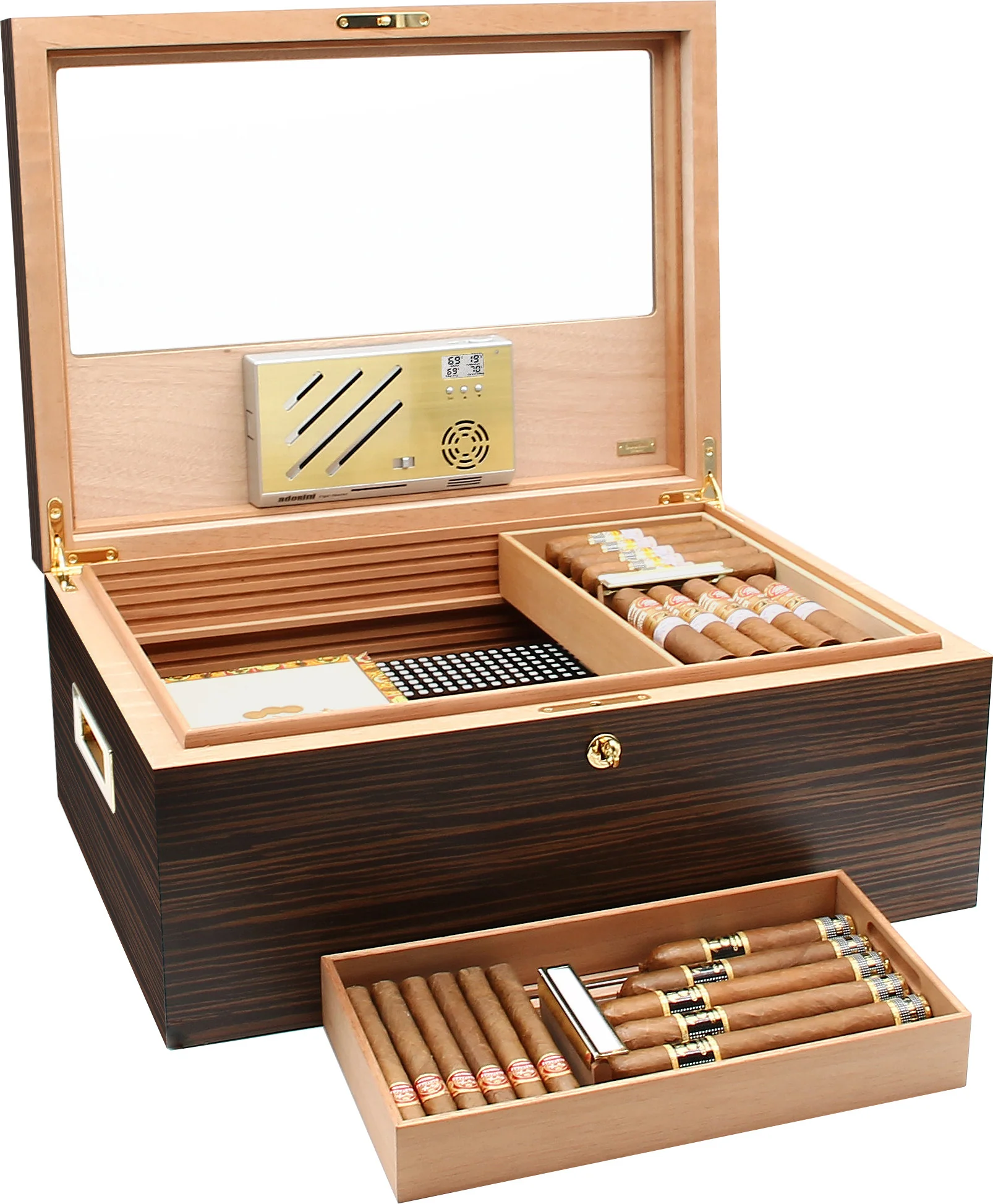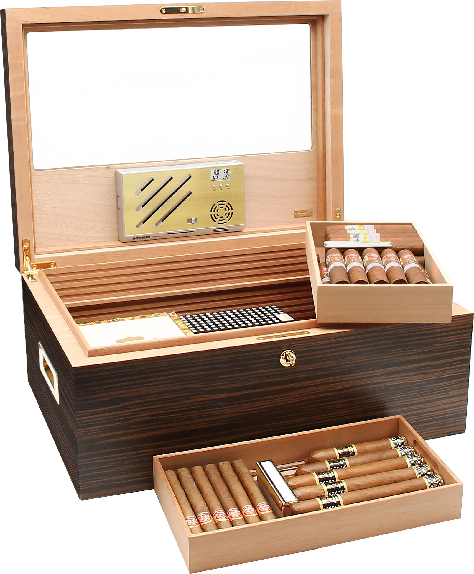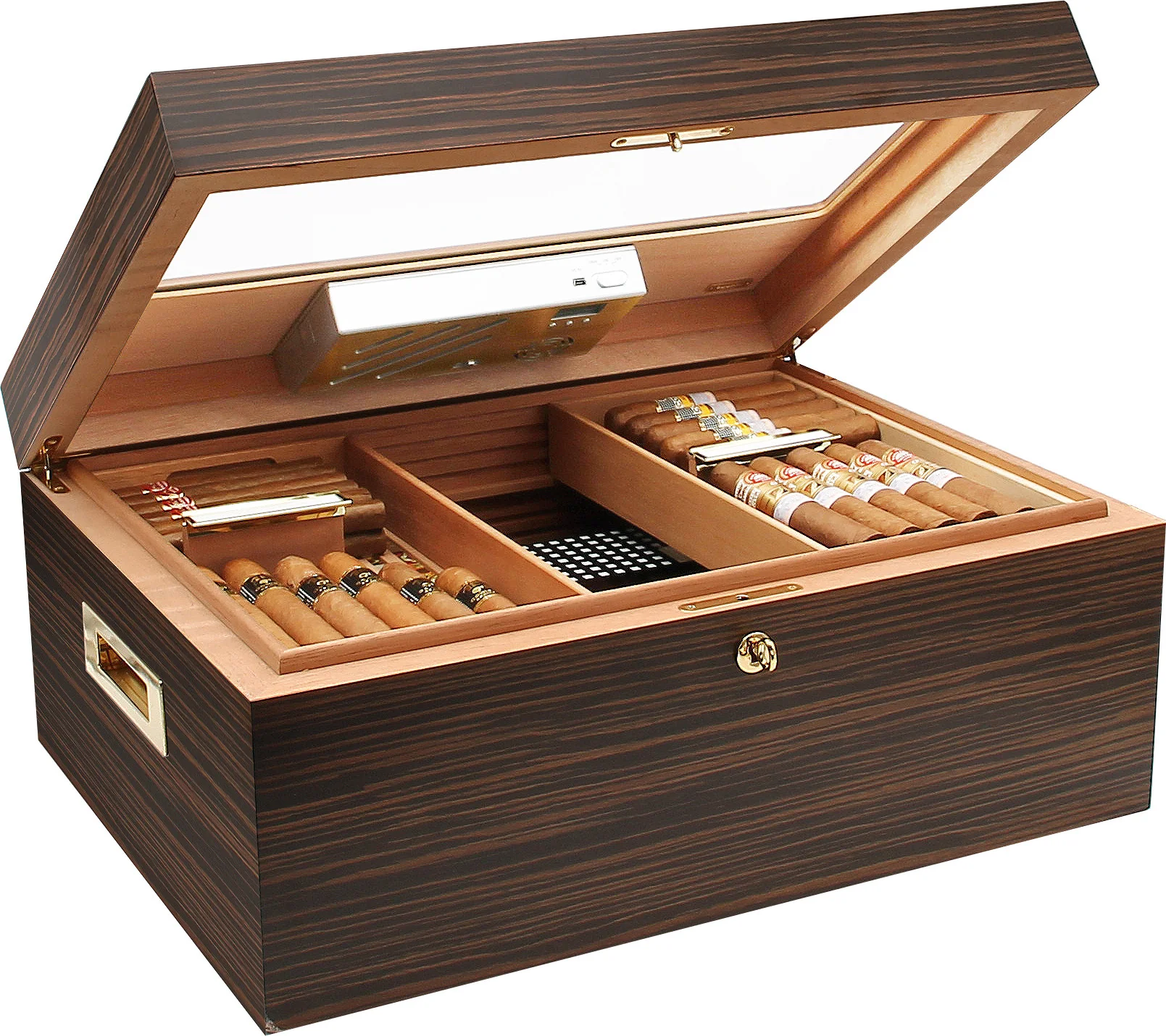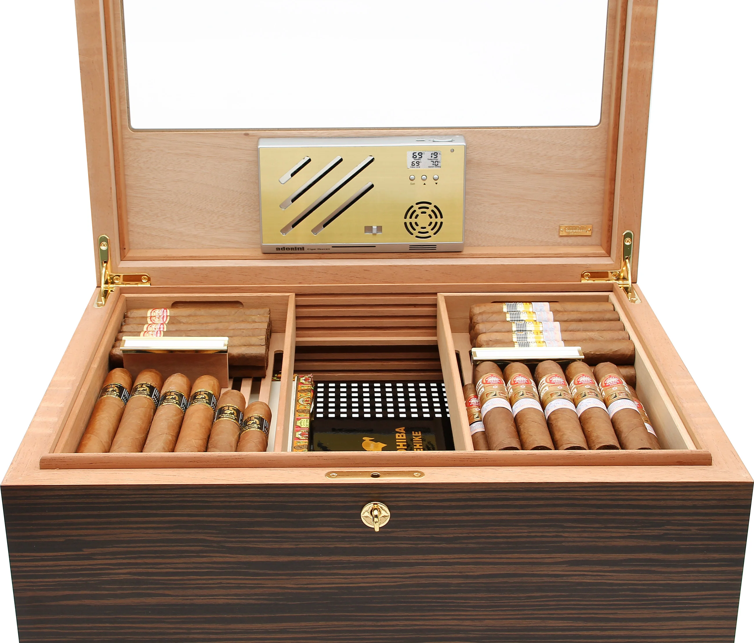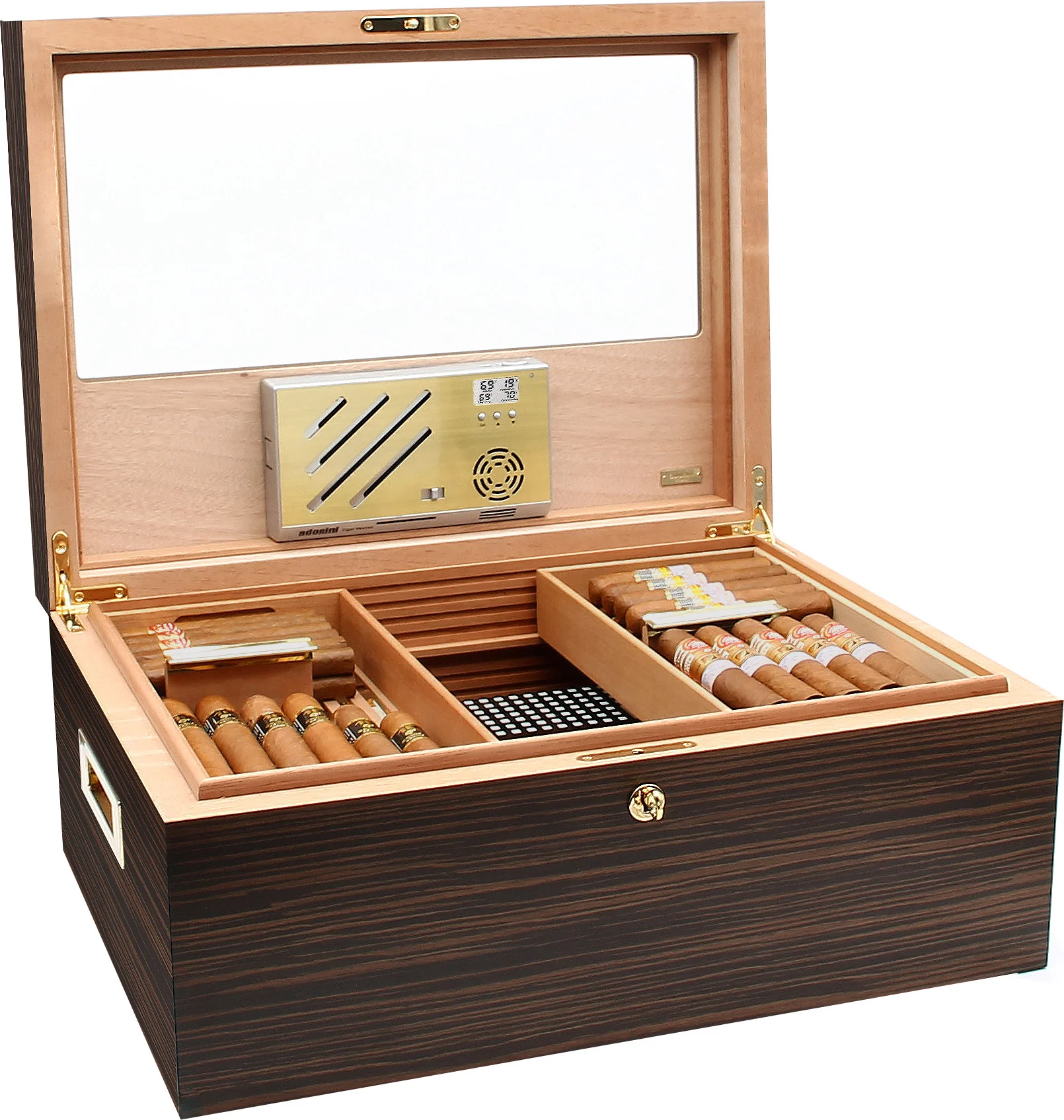 Wilgotność jest kontrolowana przez ukochany elektroniczny system nawilżania Cigar Heaven 2. generacji od adorini. Ten pięknie zaprojektowany nawilżacz może być zasilany przez zasilacz sieciowy lub wbudowany akumulator litowo-jonowy, który może wytrzymać do czterech tygodni na jednym ładowaniu. Zbiornik wody w urządzeniu utrzymuje wystarczającą ilość wody na prawie dwa miesiące nawilżania, którą można ręcznie ustawić w zakresie od 40 do 80 procent wilgotności względnej. Ekran LCD pokazuje wszystkie informacje potrzebne do utrzymania idealnych warunków, w tym aktualną wilgotność i temperaturę, wysoki i niski poziom wilgotności oraz średni 3-dniowy poziom wilgotności.