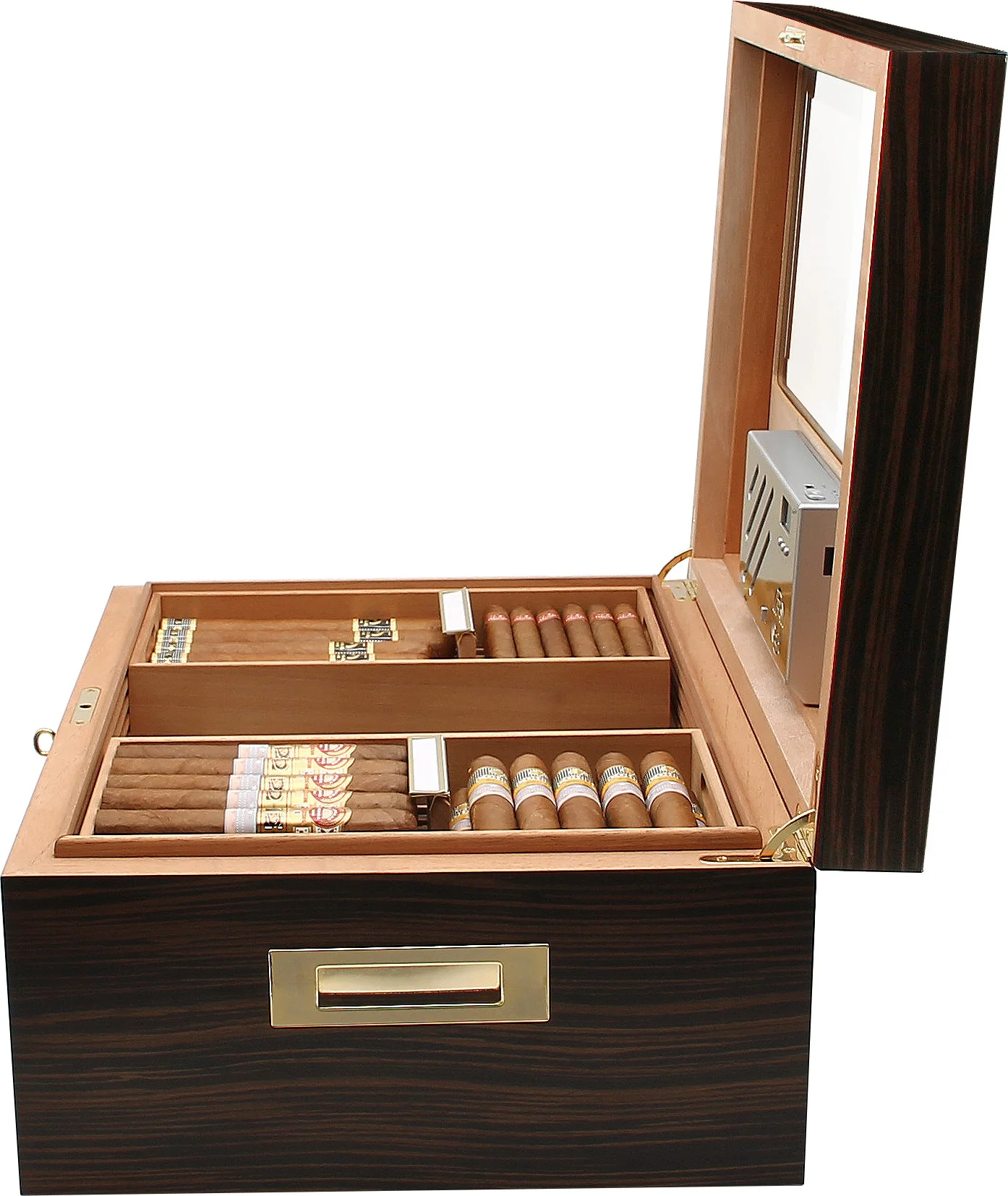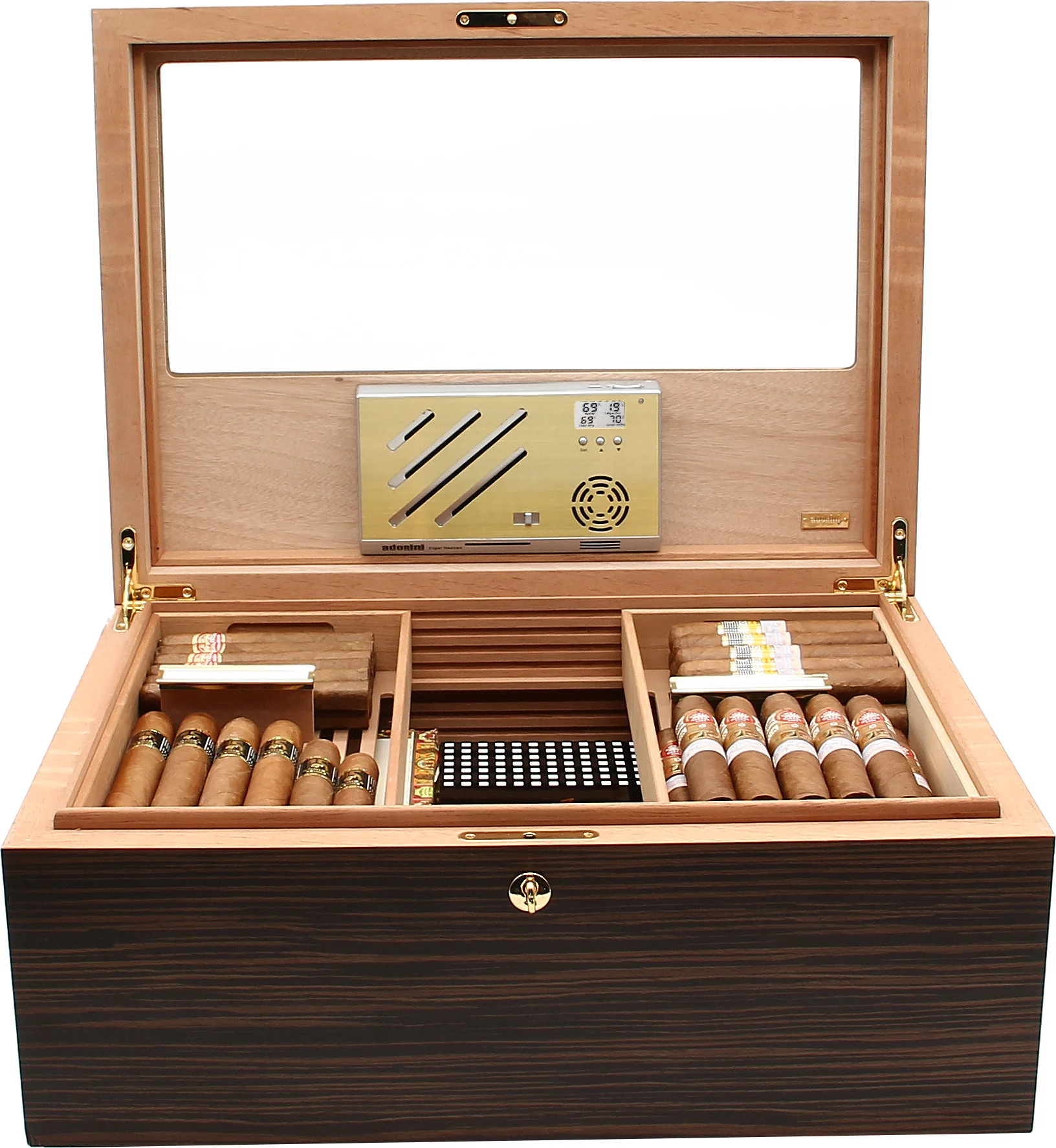 Imponująca do 500 cygar o wielkości Corona pojemność charakteryzuje ten pięknie wykonany humidor, który ma przyjemny dla oka fornir w kolorze hebanowym o półmatowym wykończeniu i pokrywkę z częściową szybą. Wytrzymałe zawiasy kwadrantowe i mocny korpus nadają humidorowi solidną podstawę, pozłacany zamek i uchwyty zapewniają dodatkowe bezpieczeństwo i łatwość poruszania się. Wyjątkowo mocny parzony hiszpański cedr tworzy wnętrze optymalnego środowiska dla cygar, co dodatkowo poprawiają innowacyjne żebra wentylacyjne RibTech firmy adorini, które pomagają zmaksymalizować przepływ powietrza przez humidor.