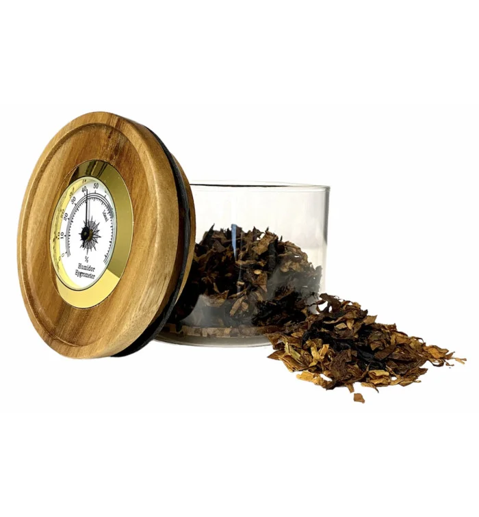 Wewnątrz słoika na tytoń znajduje się okrągła drewniana półka, pod którą zalecamy umieszczenie wkładki Boveda do nawilżania tytoniu.