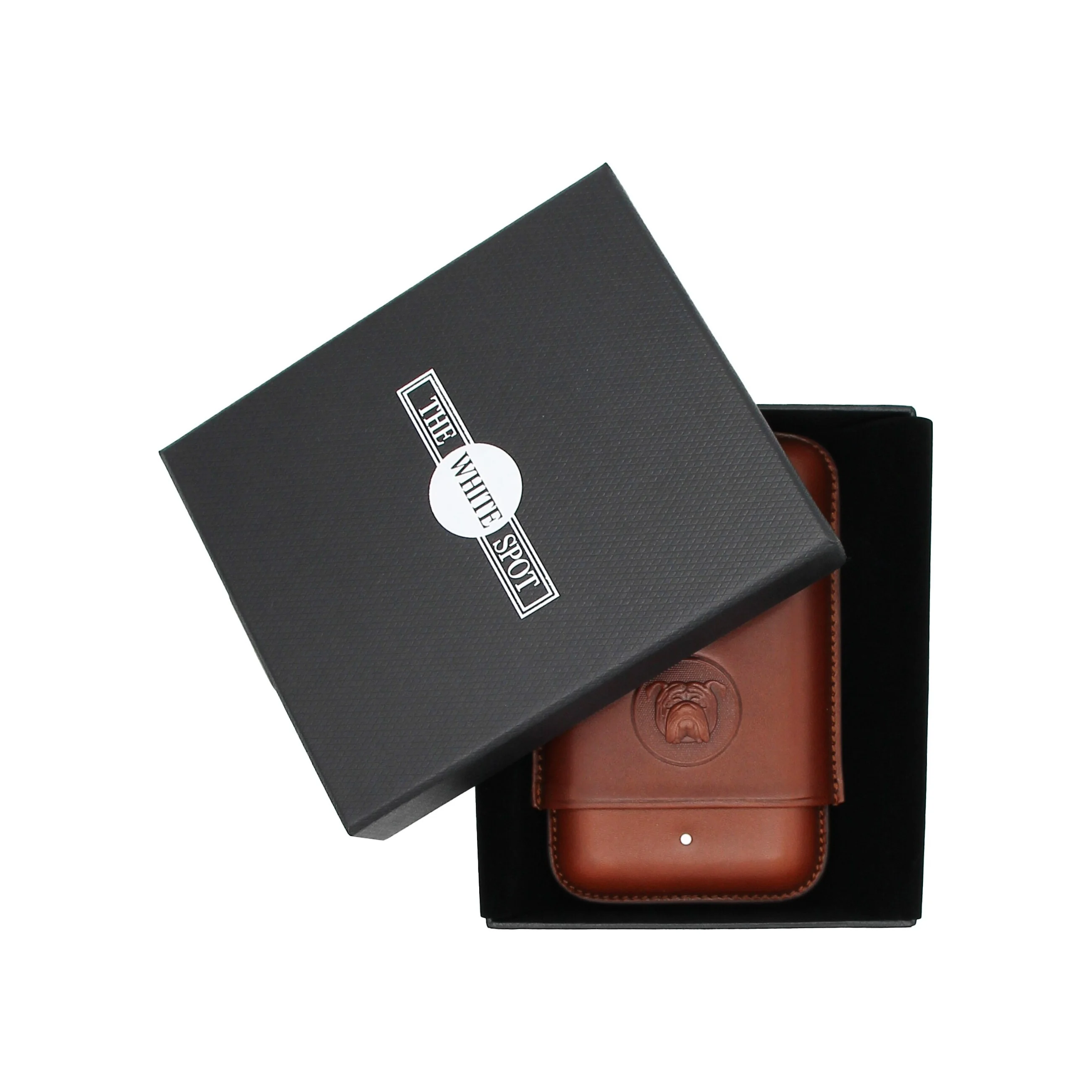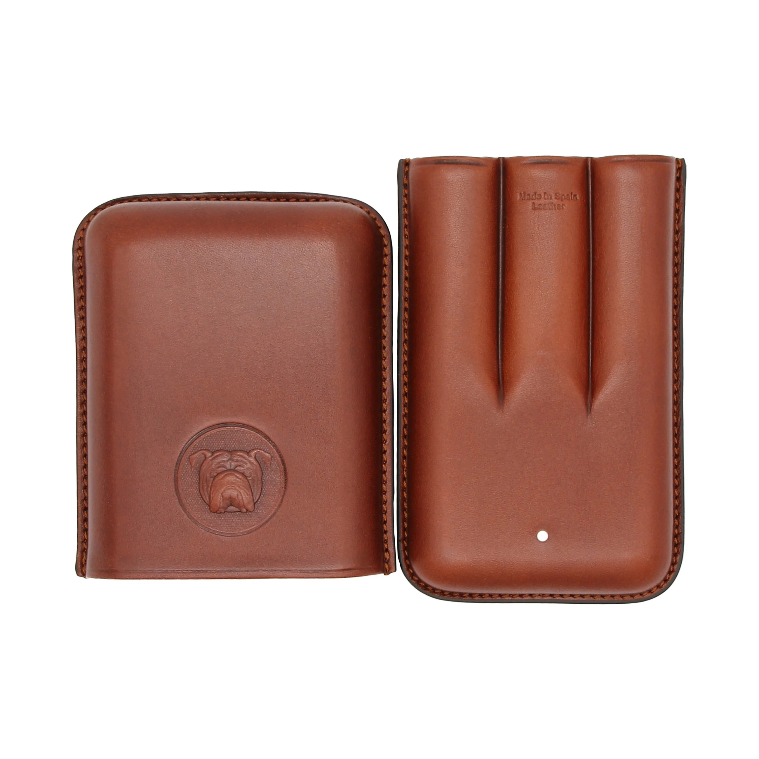 Na przedniej części etui znajduje się wytłoczone logo Bulldog, uzupełnione słynną „białą plamką”, charakterystycznym znakiem rozpoznawczym marki Dunhill. Solidne ozdobne szwy na zewnątrz dopełniają wyrafinowany wygląd.
