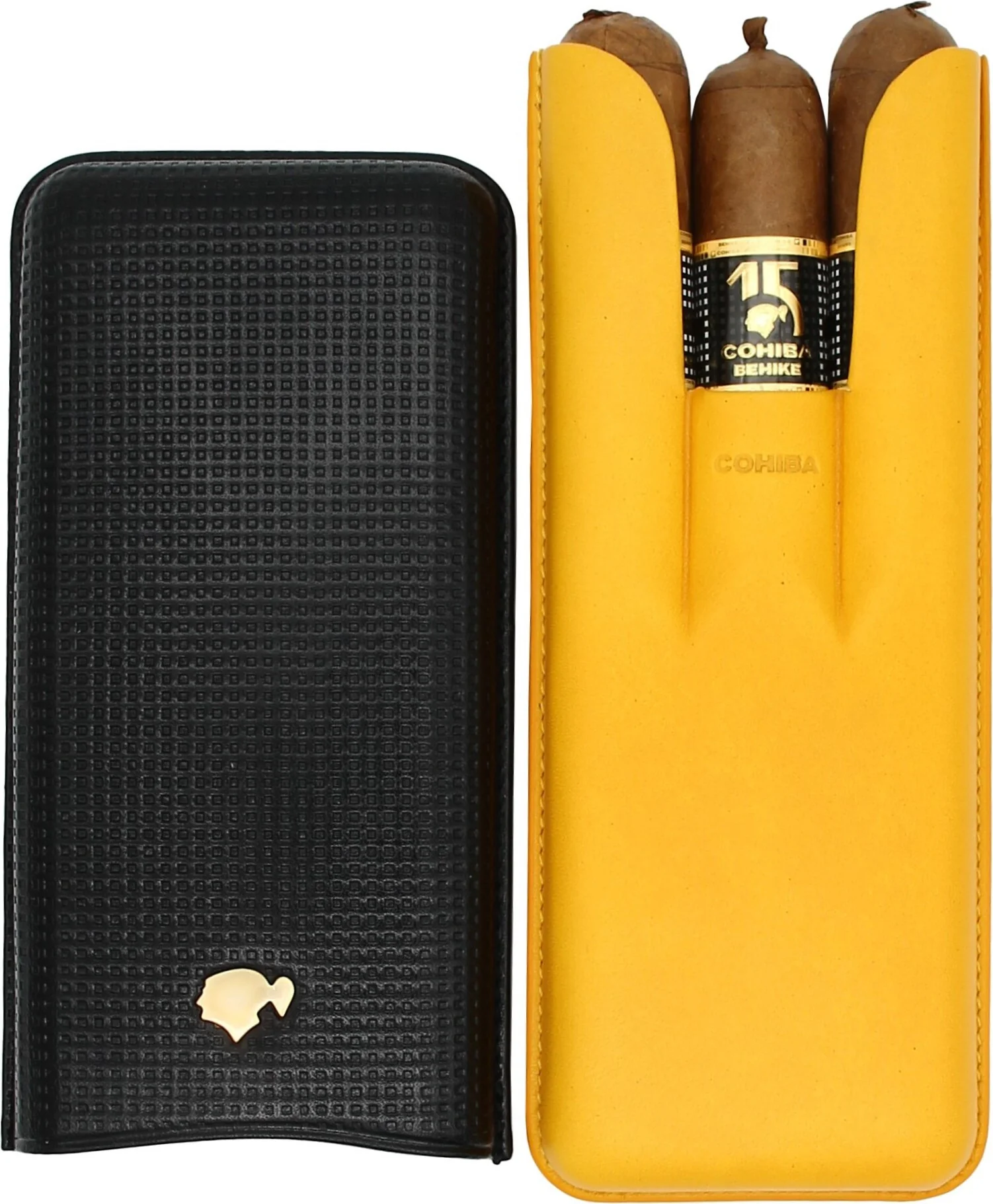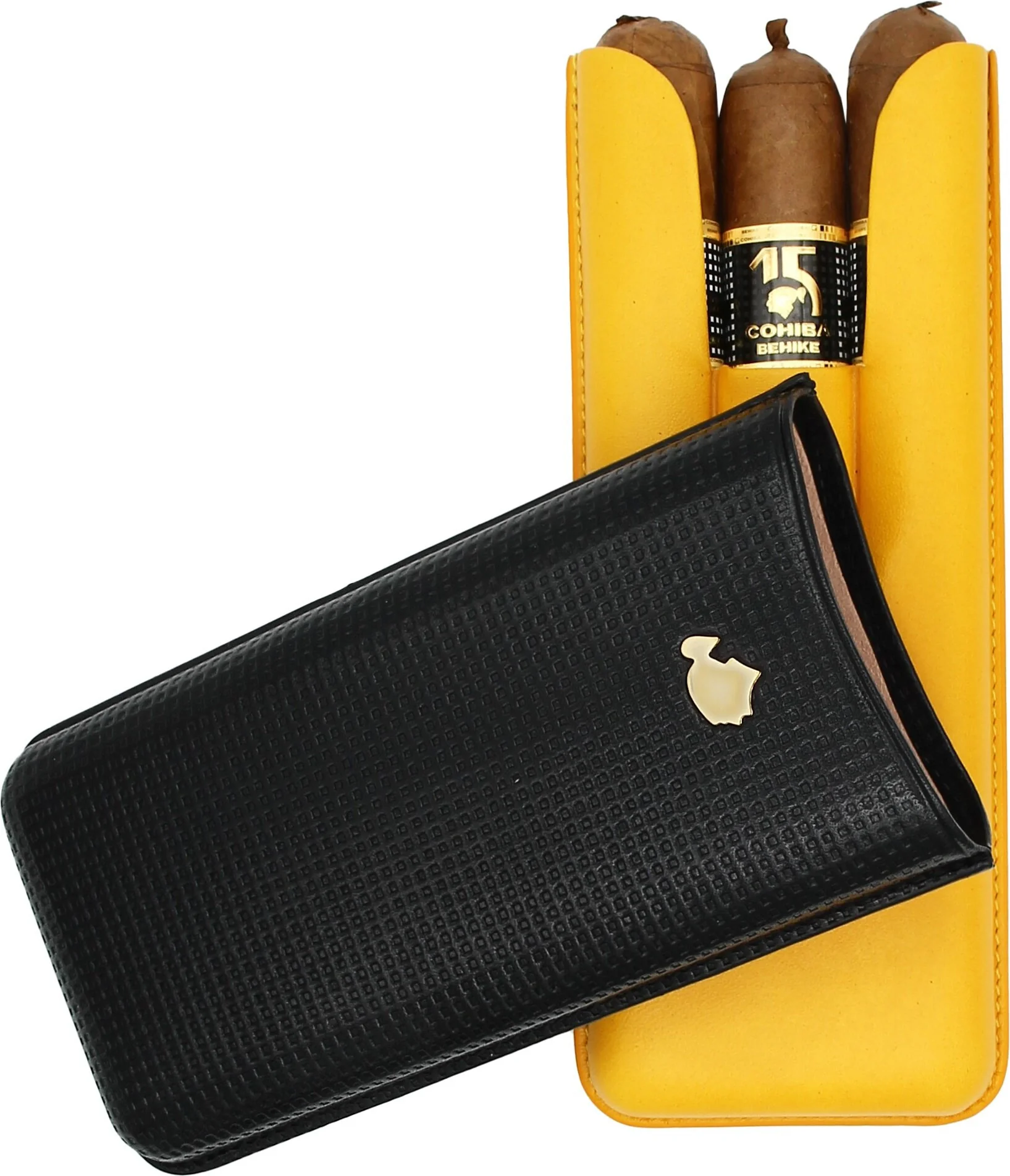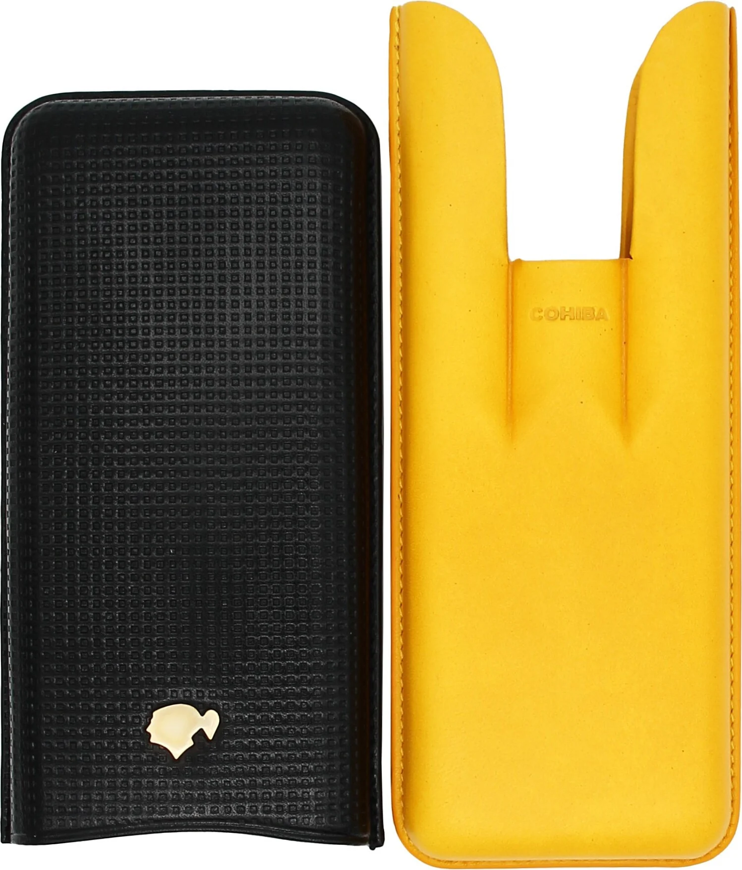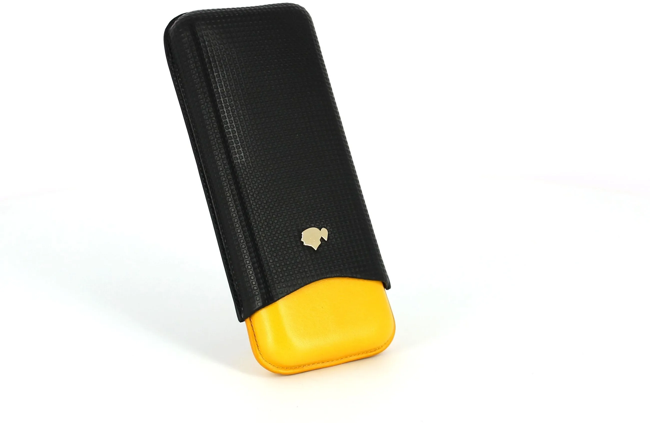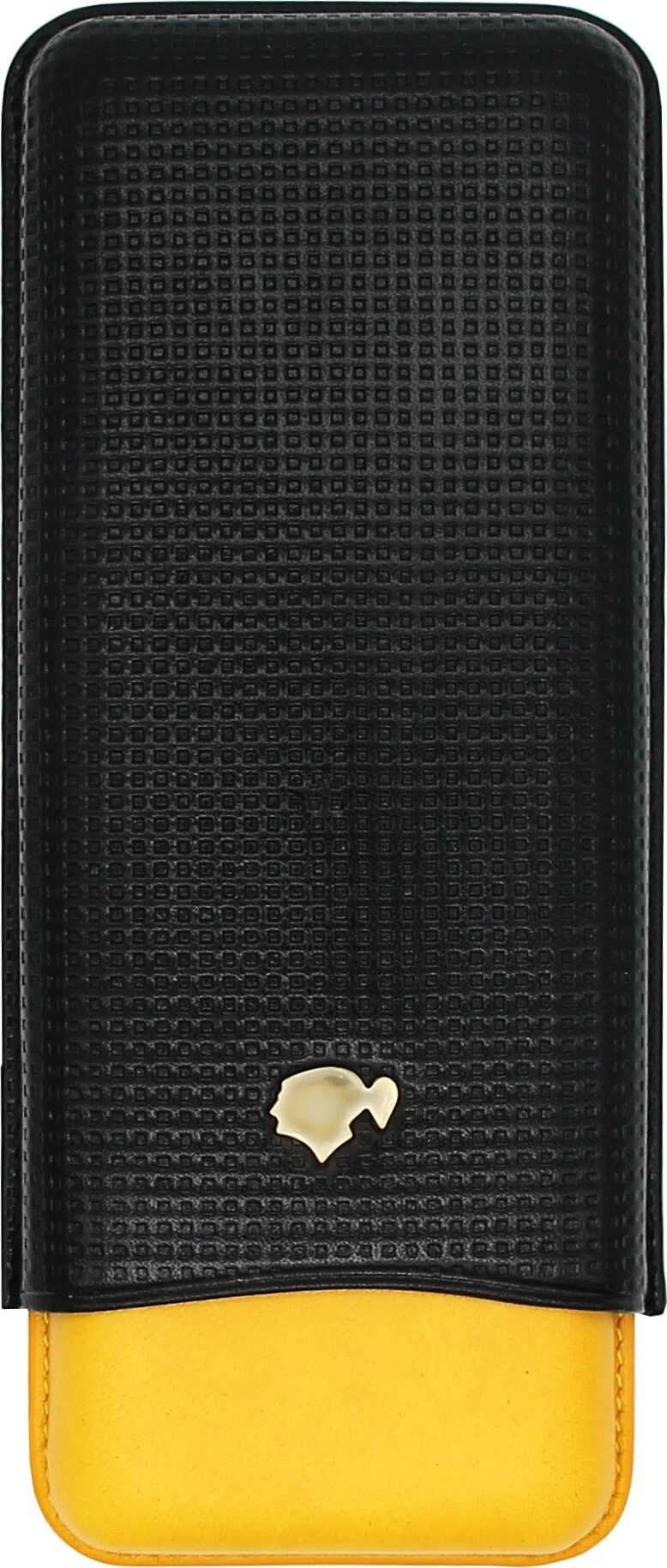 Uderzające etui na cygara z prawdziwej hiszpańskiej skóry natychmiast przyciąga wzrok swoim żółto-czarnym kolorem, który znawcy natychmiast rozpoznają jako hołd dla słynnej opaski cygarowej tej marki. Górna, czarna część etui jest ozdobiona teksturowaną kratką, wykonaną na wzór znanego kwadratowego wzoru znajdującego się na opasce cygar Cohiba. Ikoniczna sylwetka Taino w kolorze srebrnym firmy Cohiba dopełnia etui nutą elegancji.