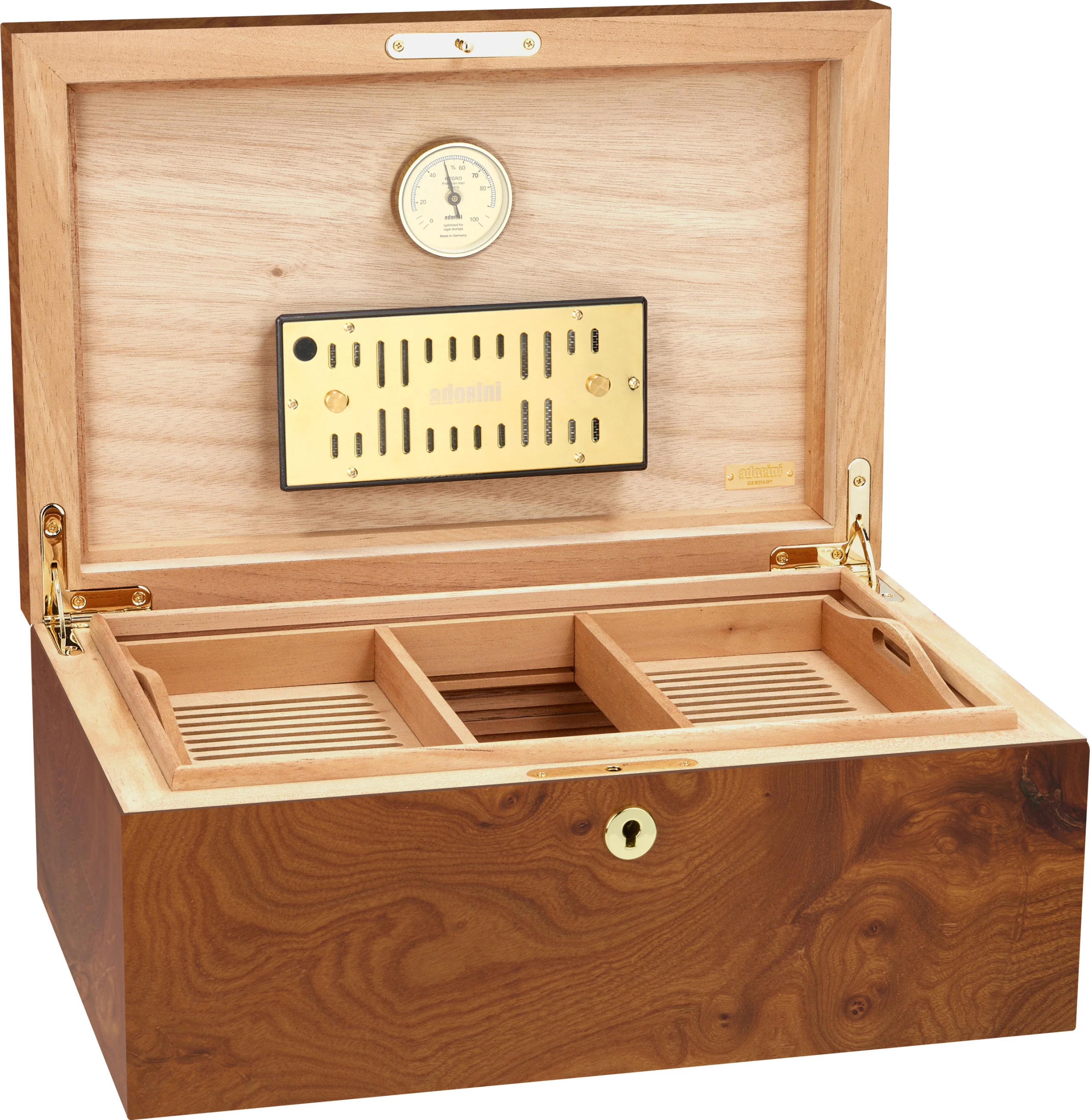 Humidor adorini Elm Specially Selected Grande e to elegancki humidor w rozmiarze Grande z kolekcji Specially Selected, nowo wprowadzonej w 2025 roku. Nazwa "Specially Selected" oznacza starannie wyselekcjonowane forniry z prawdziwego drewna pochodzenia europejskiego.
