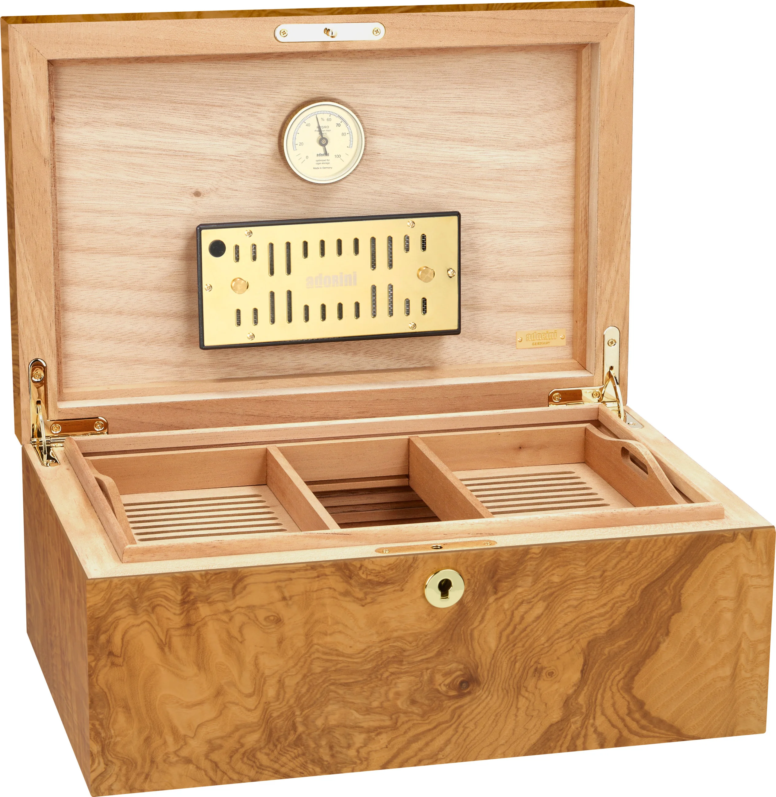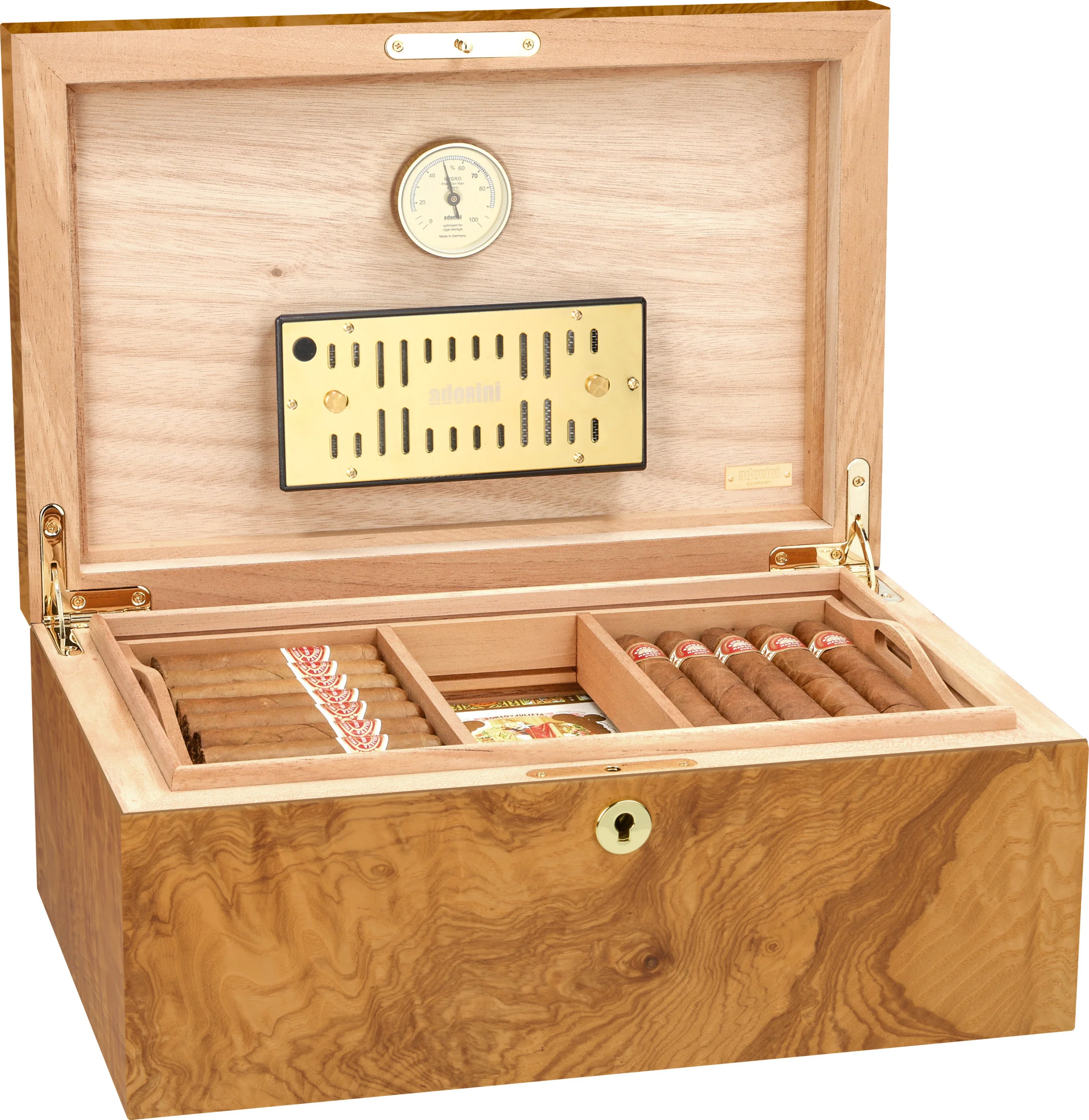 Humidor jest podzielony na dwa poziomy za pomocą dołączonej wyjmowanej tacy. Poziome i pionowe przeg rody oraz klipsy na etykiety pozwalają na jeszcze bardziej stylową organizację wnętrza. Ozdobione złotymi elementami, takimi jak zamek i zawiasy, wnętrze tworzy harmonijny wygląd w połączeniu z jasnym kolorem klonu.