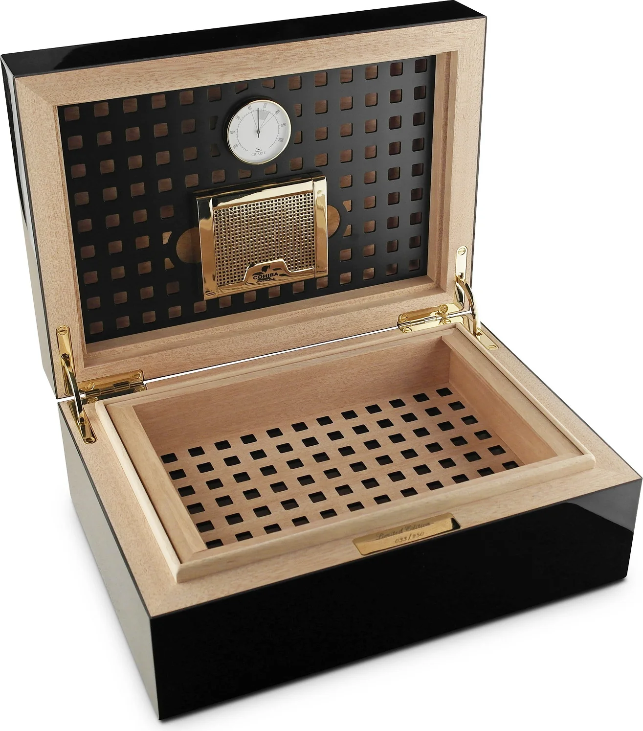 Humidor posiada czarne wykończenie o wysokim połysku, przypominające szlachetny lakier fortepianowy. Tradycyjne złote elementy dodają eleganckich akcentów. Słynne logo Cohiba jest wyraźnie widoczne na pokrywie. Po otwarciu ukazują się wysokiej jakości złote zawiasy i tabliczka wskazująca indywidualny numer limitowanej edycji.
