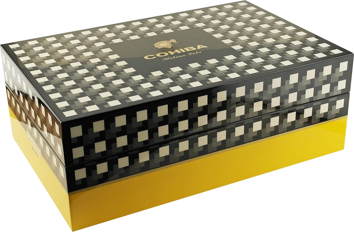 Humidor jest prezentowany w niepowtarzalnych kolorach Cohiba: czarnym, żółtym i białym, które miłośnicy na całym świecie natychmiast kojarzą z marką. Logo marki Co hiba jest wyraźnie widoczne na pokrywie. Po otwarciu ujawniają się wysokiej jakości złote zawiasy, na których również wytłoczono nazwę Cohiba. Wewnątrz znajduje się tabliczka z indywidualnym numerem limitowanej edycji.