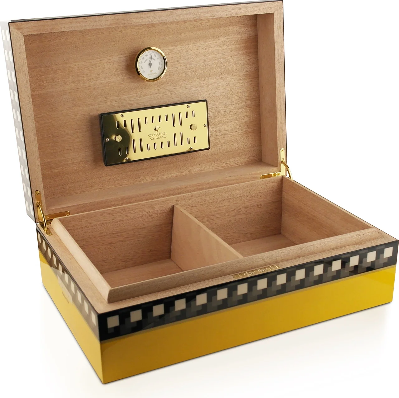W zestawie znajduje się higrometr i nawilżacz na bazie gąbki. Oba elementy są magnetycznie przymocowane do pokrywy humidora i są bezpiecznie i precyzyjnie zintegrowane.