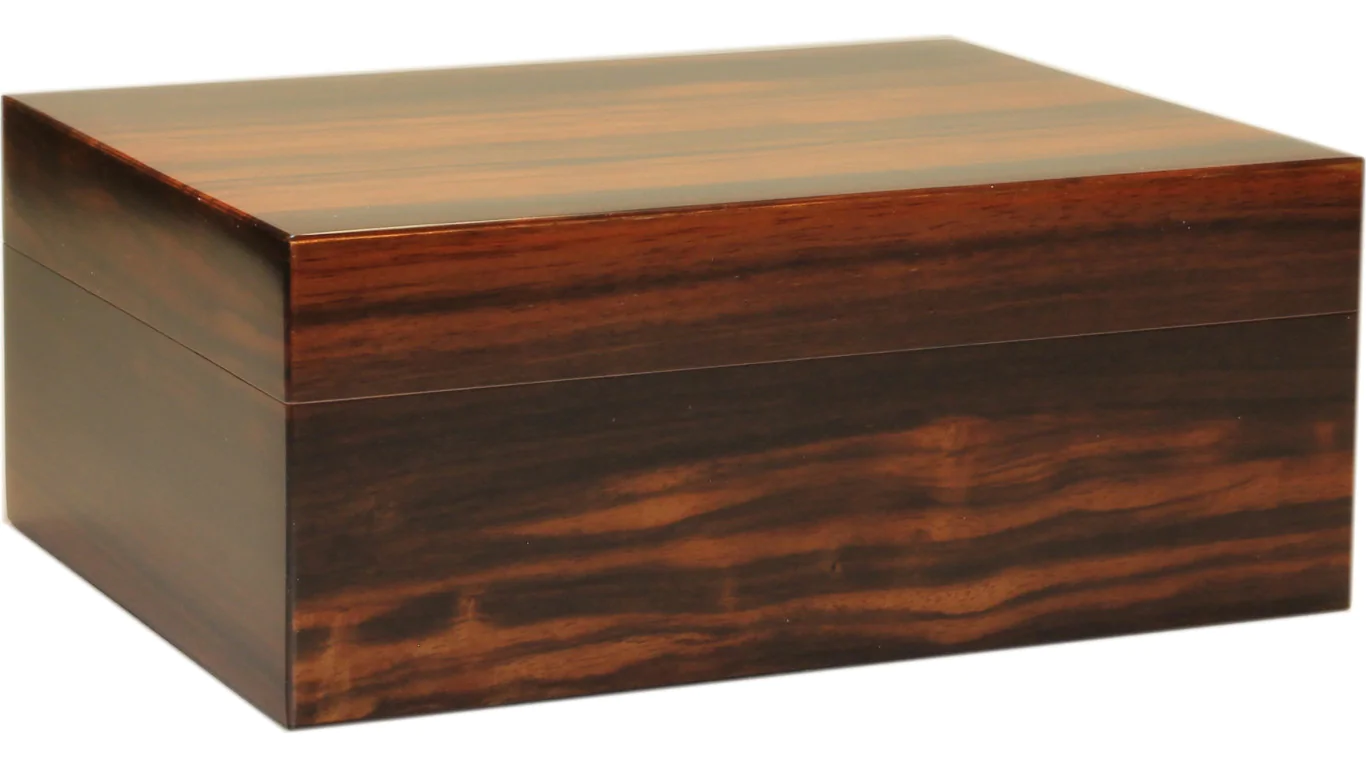 Wykończenie szronionym lakierem pięknie podkreśla jasne i ciemne brązy egzotycznego forniru Makassar. Bogata faktura drewna dodaje wyrafinowanego uroku każdemu wystrojowi, zapewniając jednocześnie miejsce do przechowywania do 35 cygar w rozmiarze Corona.