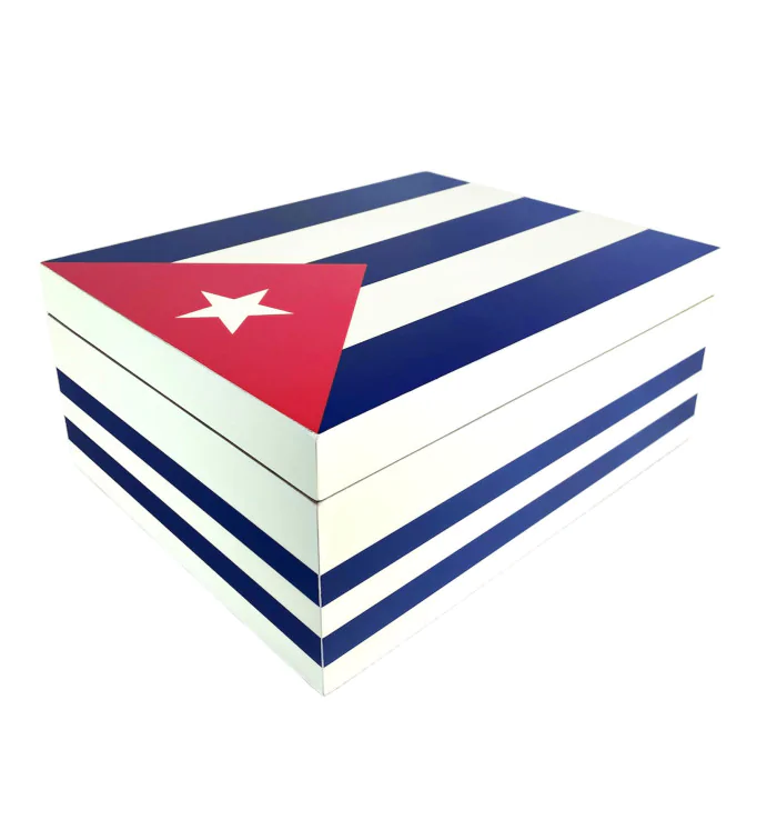 Poznaj luksusowe rozwiązanie do przechowywania swoich cennych cygar dzięki temu stylowemu humidorowi na cygara w promiennej bieli, ozdobionemu kultową kubańską flagą. Ten humidor nie tylko oferuje stylową prezentację, ale także zapewnia optymalne środowisko do przechowywania od 50 do 75 twoich ulubionych cygar.