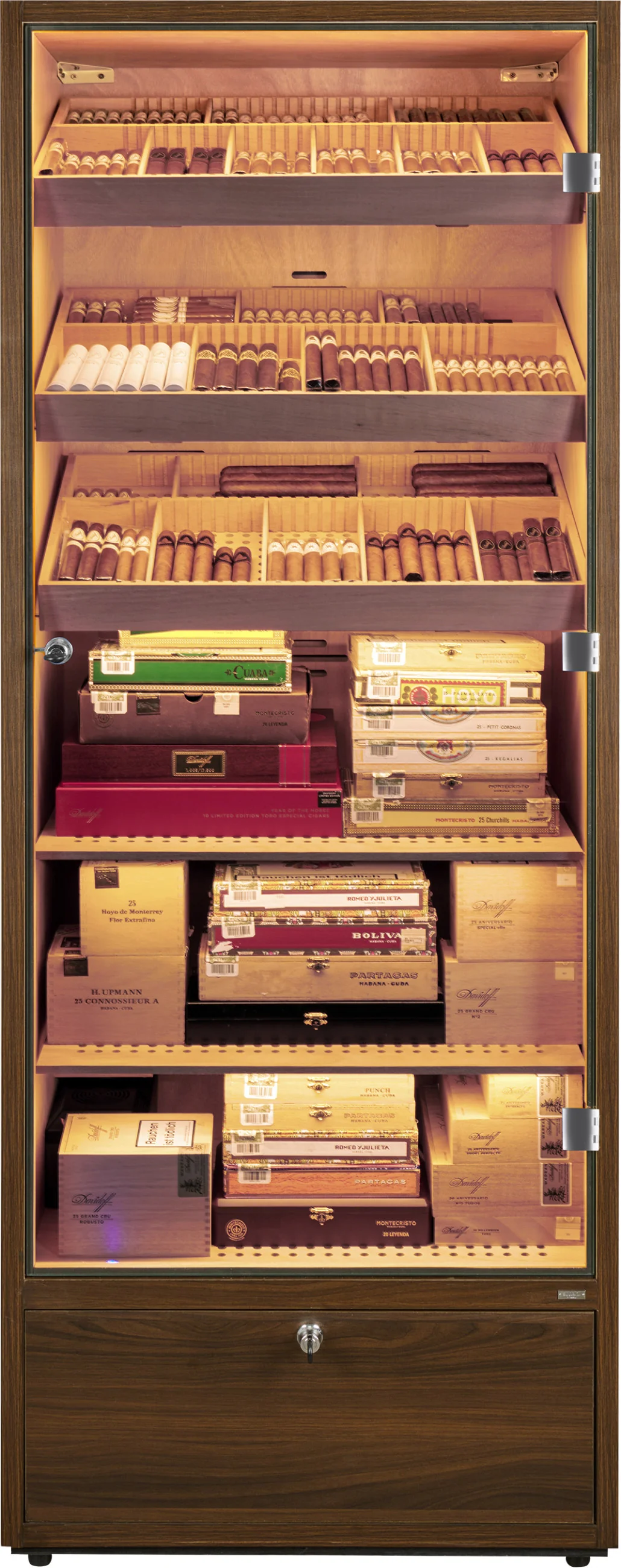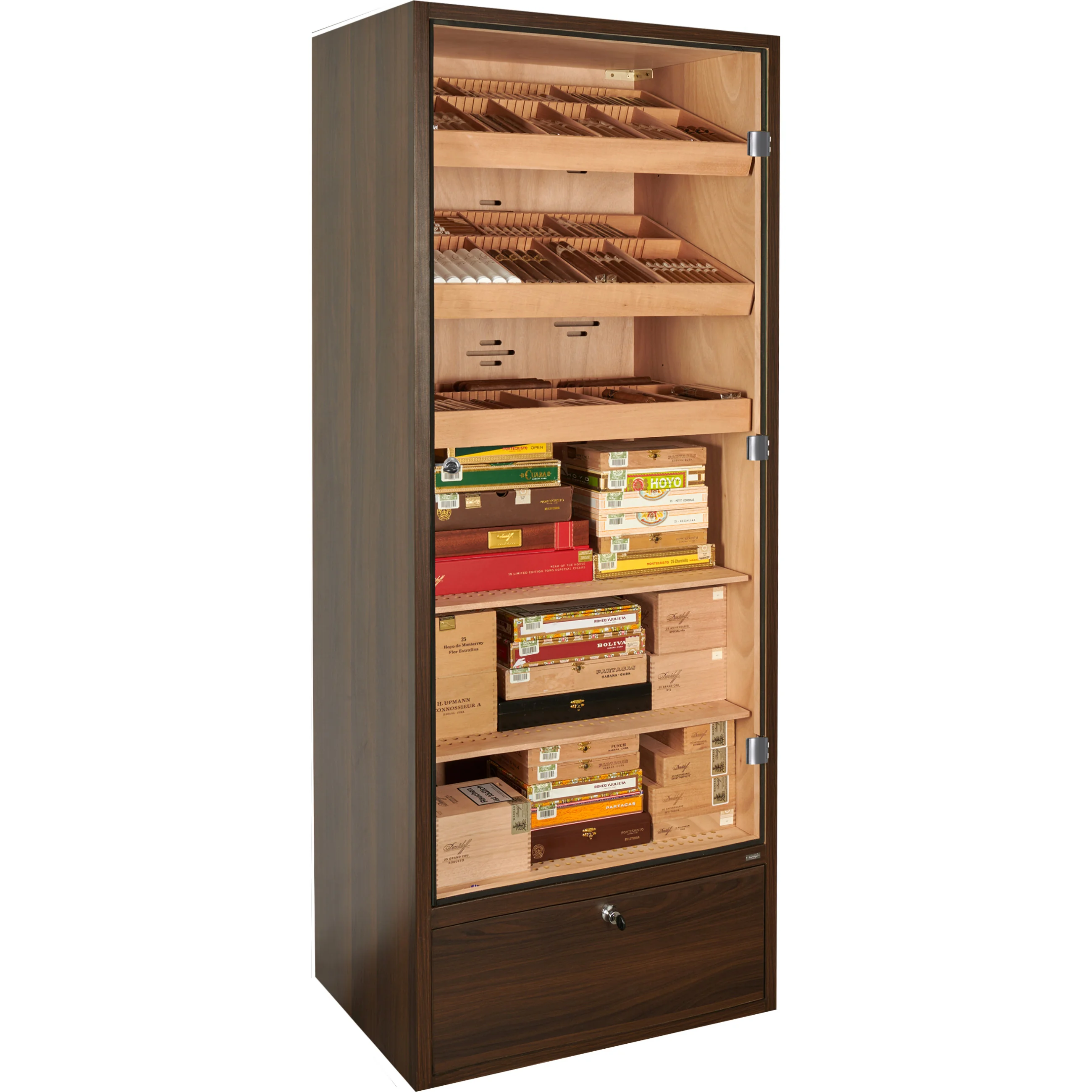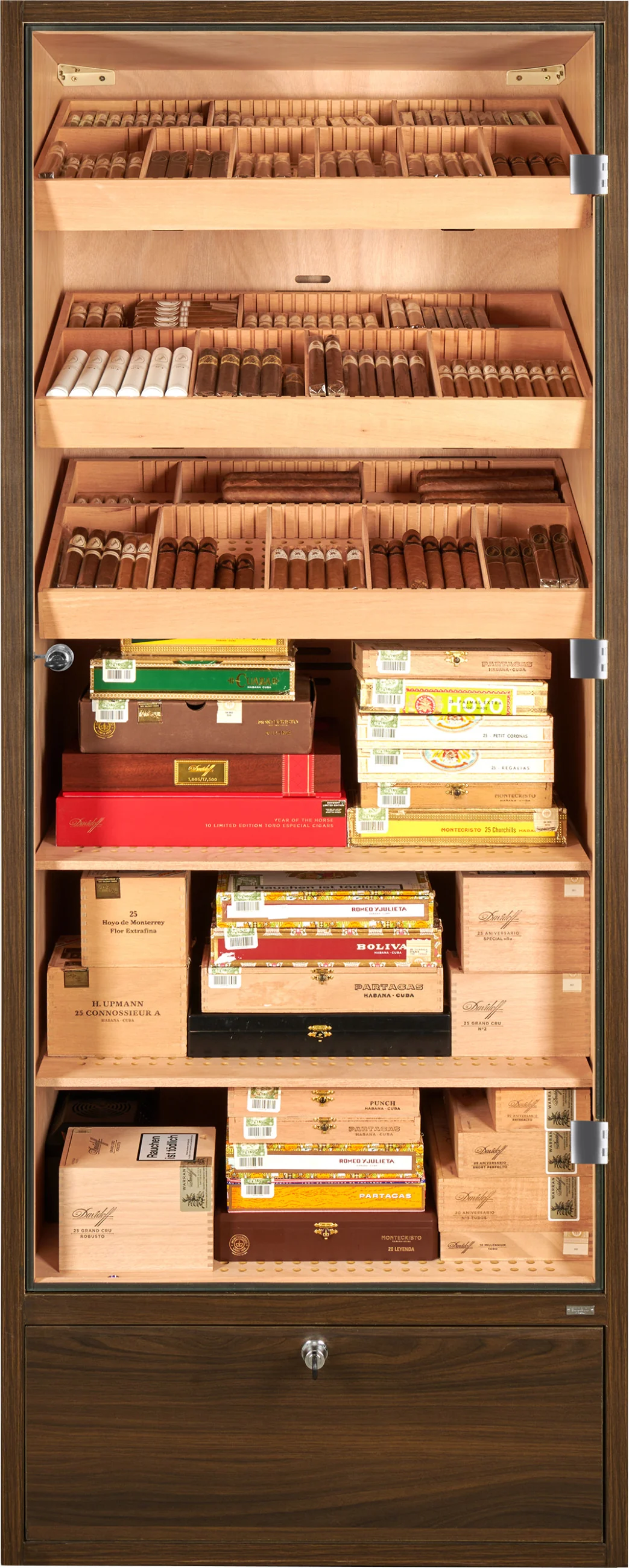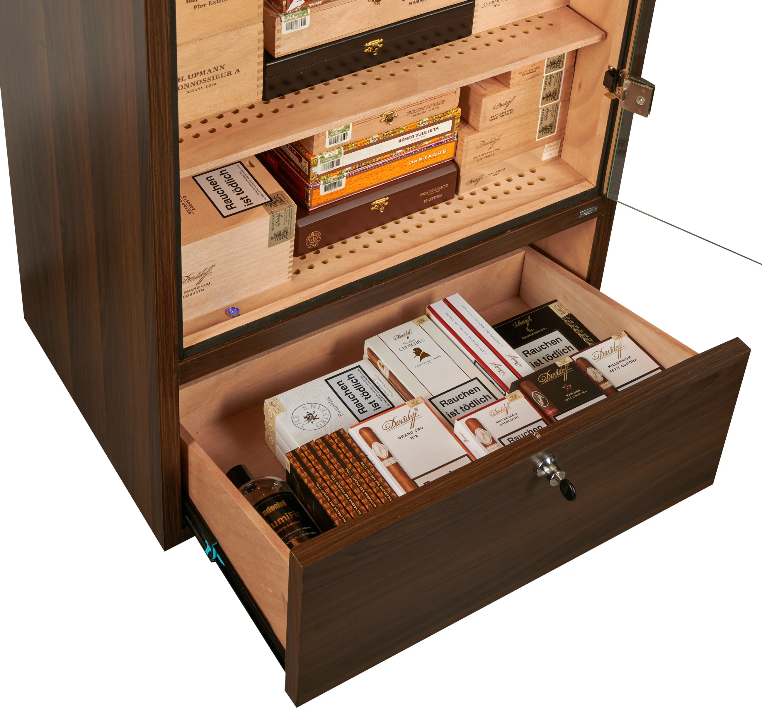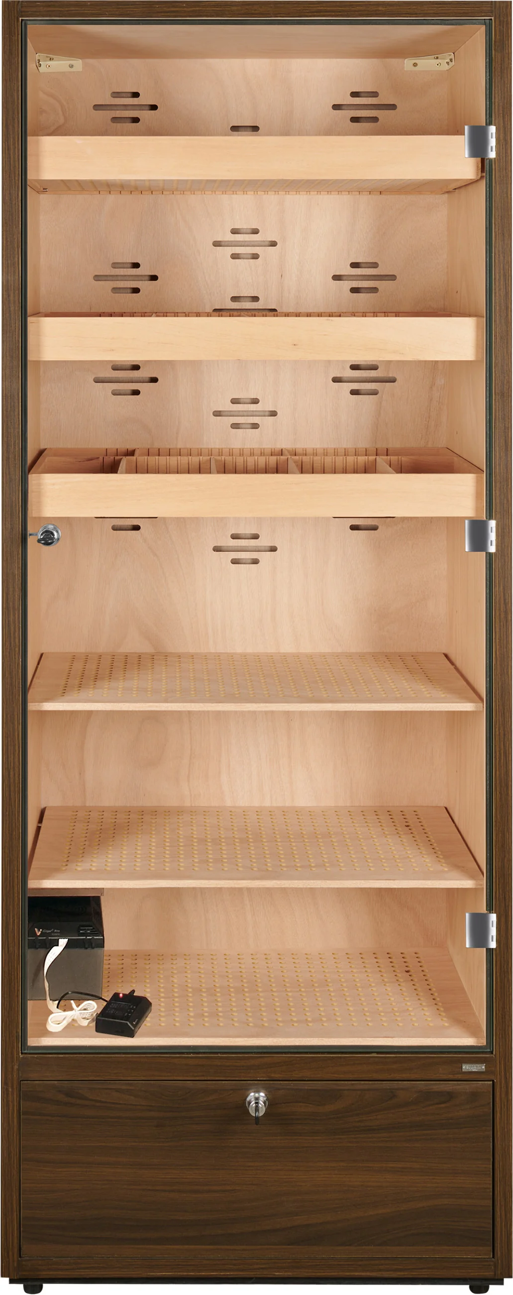 W podstawie szafki na cygara znajduje się zamykana szuflada, która może służyć do przechowywania cygar, a także akcesoriów lub materiałów eksploatacyjnych, takich jak woda destylowana. Dno szuflady jest perforowane i oddzielone od wnętrza, co pozwala na cyrkulację wilgoci i zapewnia bezpieczne przechowywanie cygar.