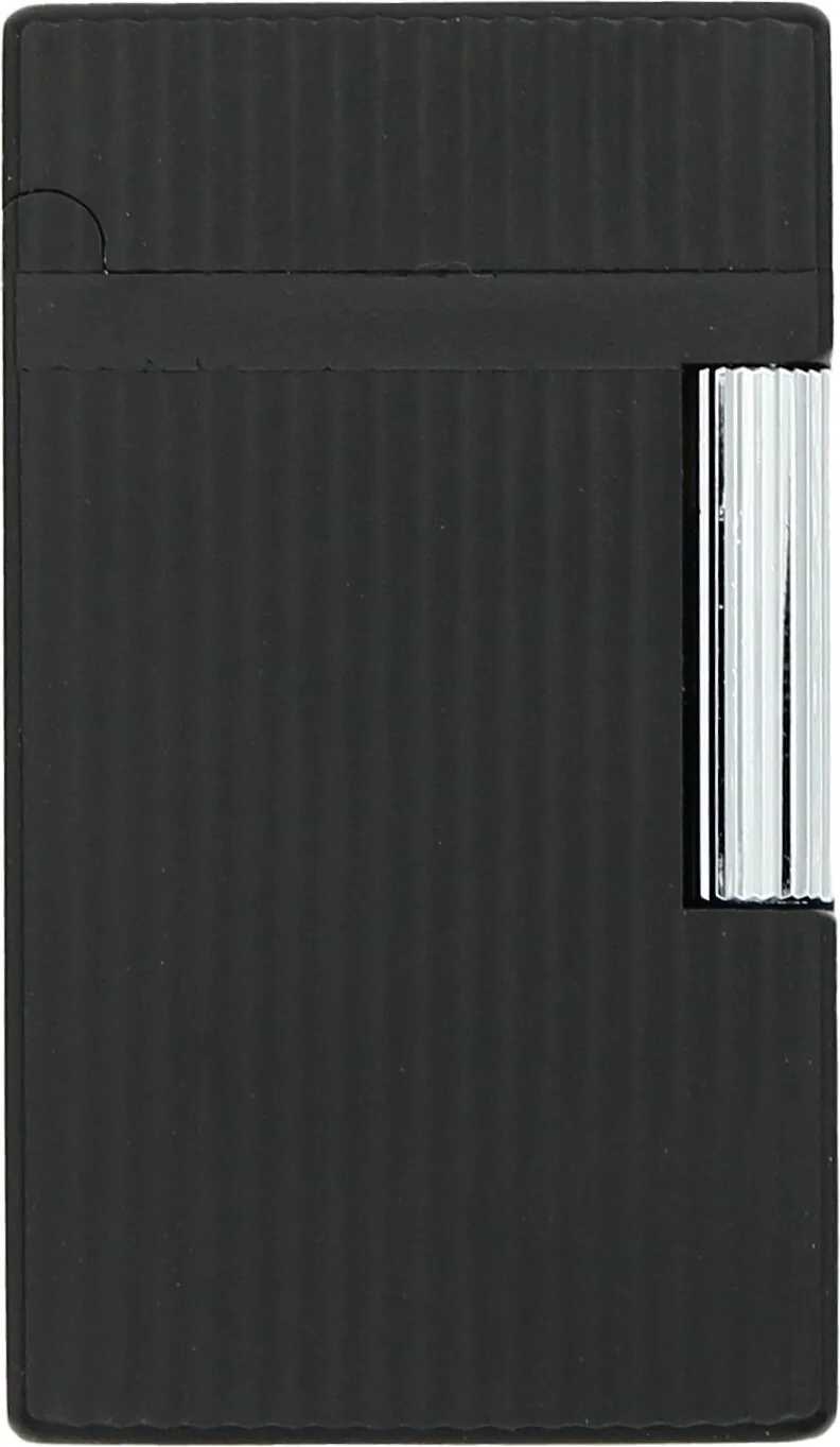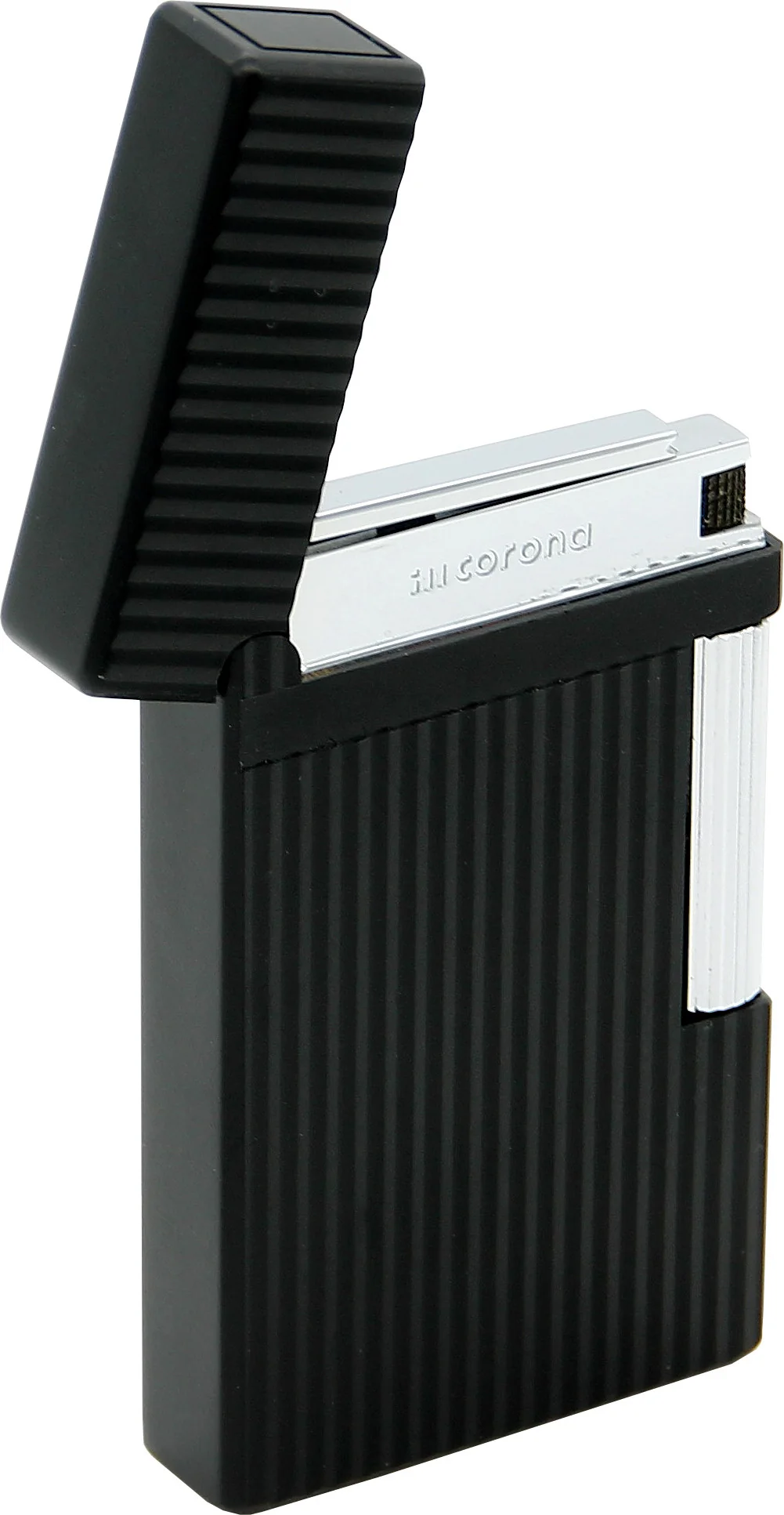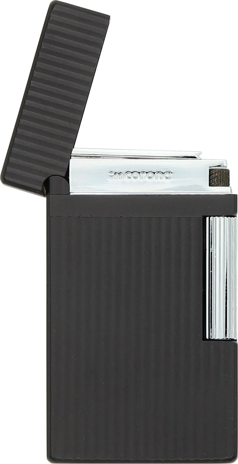 IM Corona Double Corona to elegancka zapalniczka w kolorze matowej czerni z błyszczącymi srebrnymi elementami dekoracyjnymi, która łączy w sobie klasyczny design i nowoczesną elegancję.