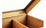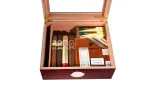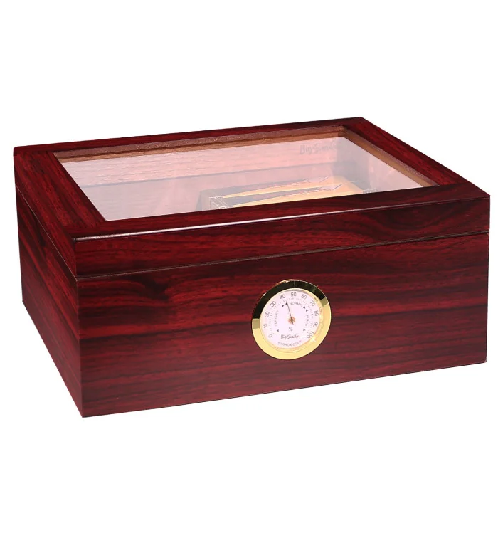 Średni brązowy humidor BigSmoke ze szklaana pokrywą Elegancki humidor od BigSmoke oferuje wystarczająco dużo miejsca na twoje cenne skarby o szacowanej pojemności około 50 cygar. Nawet mniejsze pudełka z cygarami z łatwością znajdą swoje miejsce. Eleganckie usłojenie humidora uzupełnia szklana pokrywa, która umożliwia wgląd do wnętrza bez konieczności otwierania humidora. Analogowy higrometr oparty na metalowej spirali jest osadzony z przodu i jest łatwy do odczytania przez cały czas. Dołączony nawilżacz prętowy działa w oparciu o kryształy polimeru akrylowego i zapewnia stały poziom wilgotności. Pionowa przegroda umożliwia elastyczny podział i organizację wnętrza. Aby chronić meble, na których umieszczony jest humidor, podstawa pokryta jest filcem. Szczegóły techniczne: