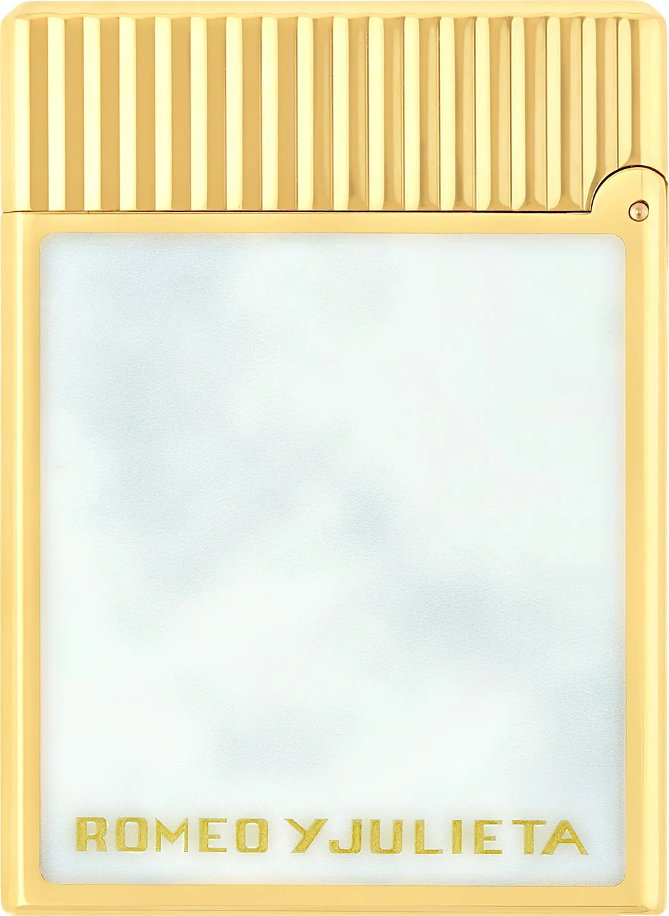 Przód zapalniczki zdobi reliefowy medalion przedstawiający słynną scenę balkonową z Romea i Julii, symbol miłości i namiętności. Biały lakier otacza medalion, który powtarza się również z tyłu. Znajdziesz tam również elegancki napis "Romeo y Julieta".