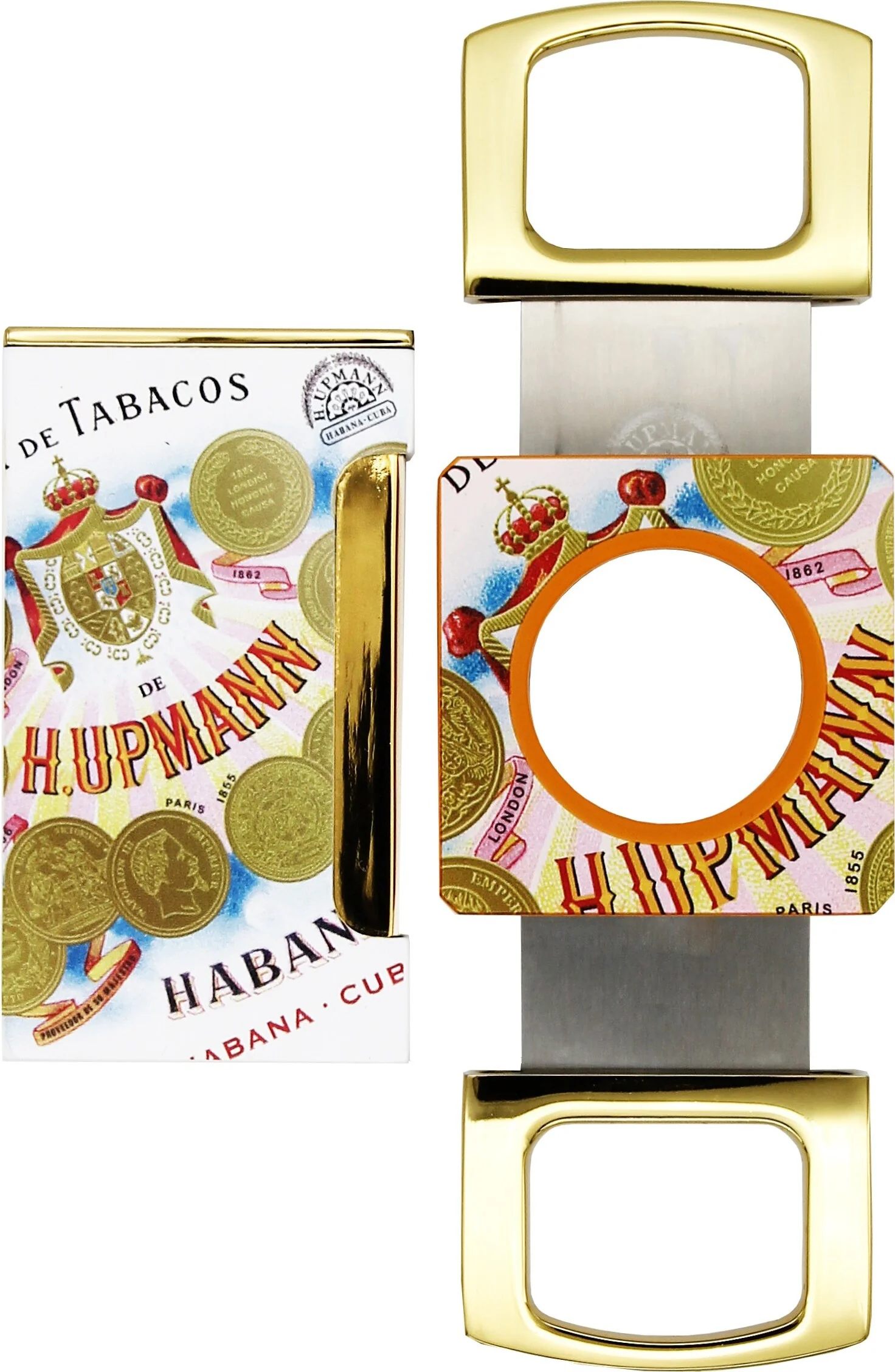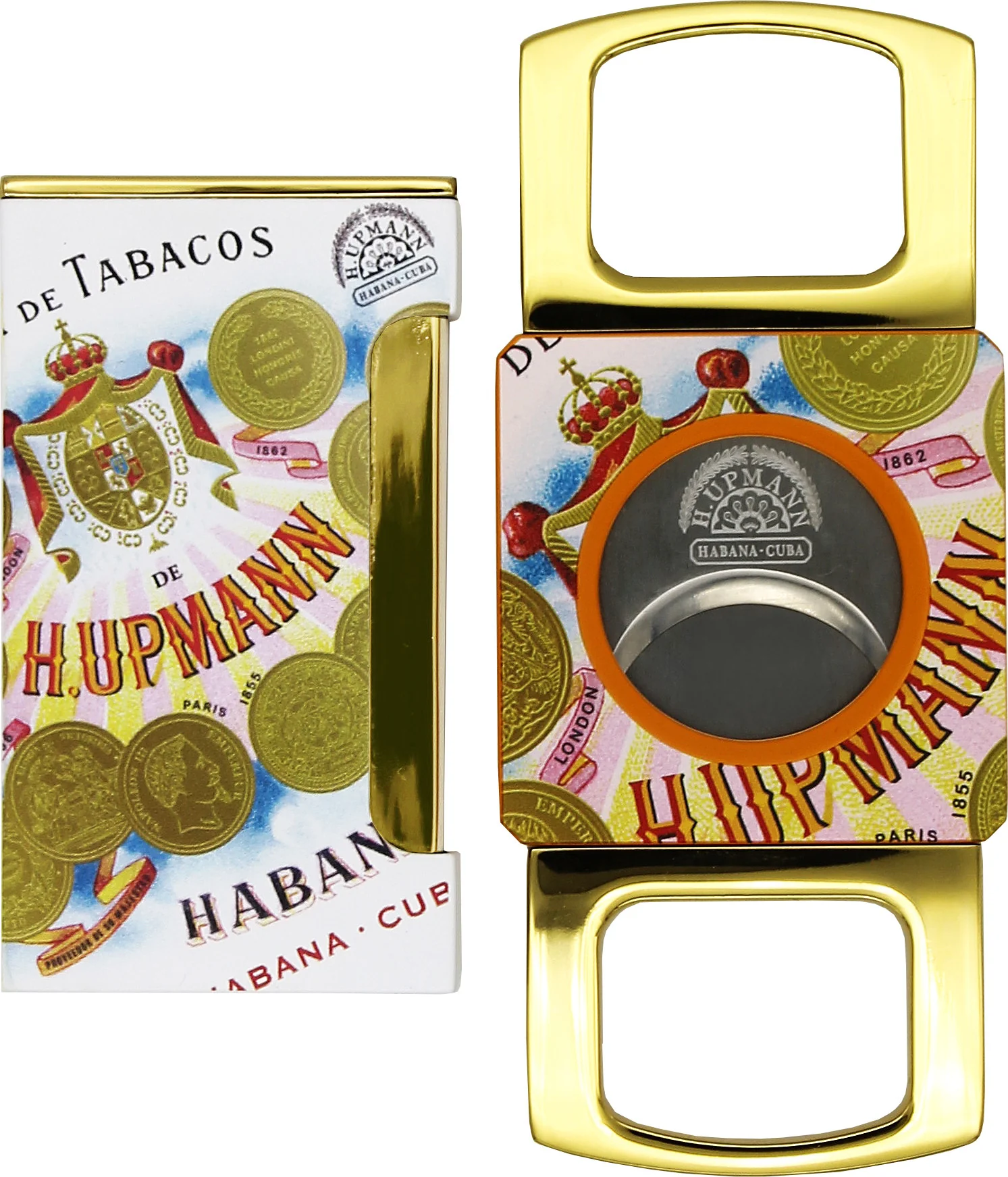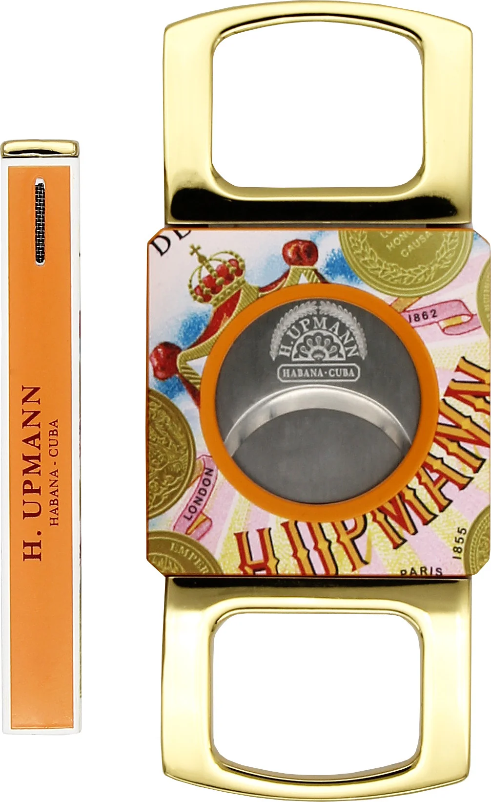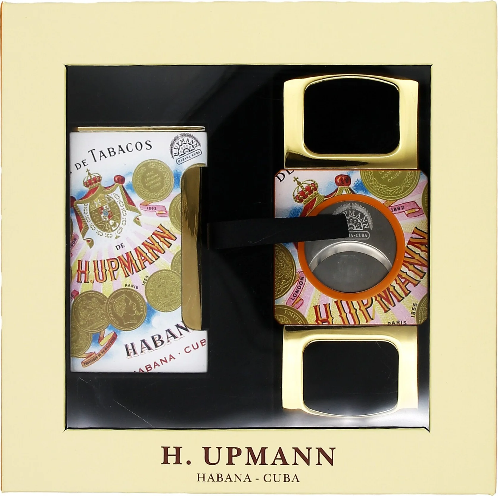 Zestaw z zapalniczką i obcinaczem do cygar H. Upmann łączy w sobie dwa wysokiej jakości akcesoria znanej kubańskiej marki cygar H. Upmann. Oba elementy zestawu posiadają charakterystyczne dla marki H. Upmann motywy medalionu i logo marki w pomarańczowych odcieniach po obu stronach, tworząc charakterystyczny i kultowy wygląd.