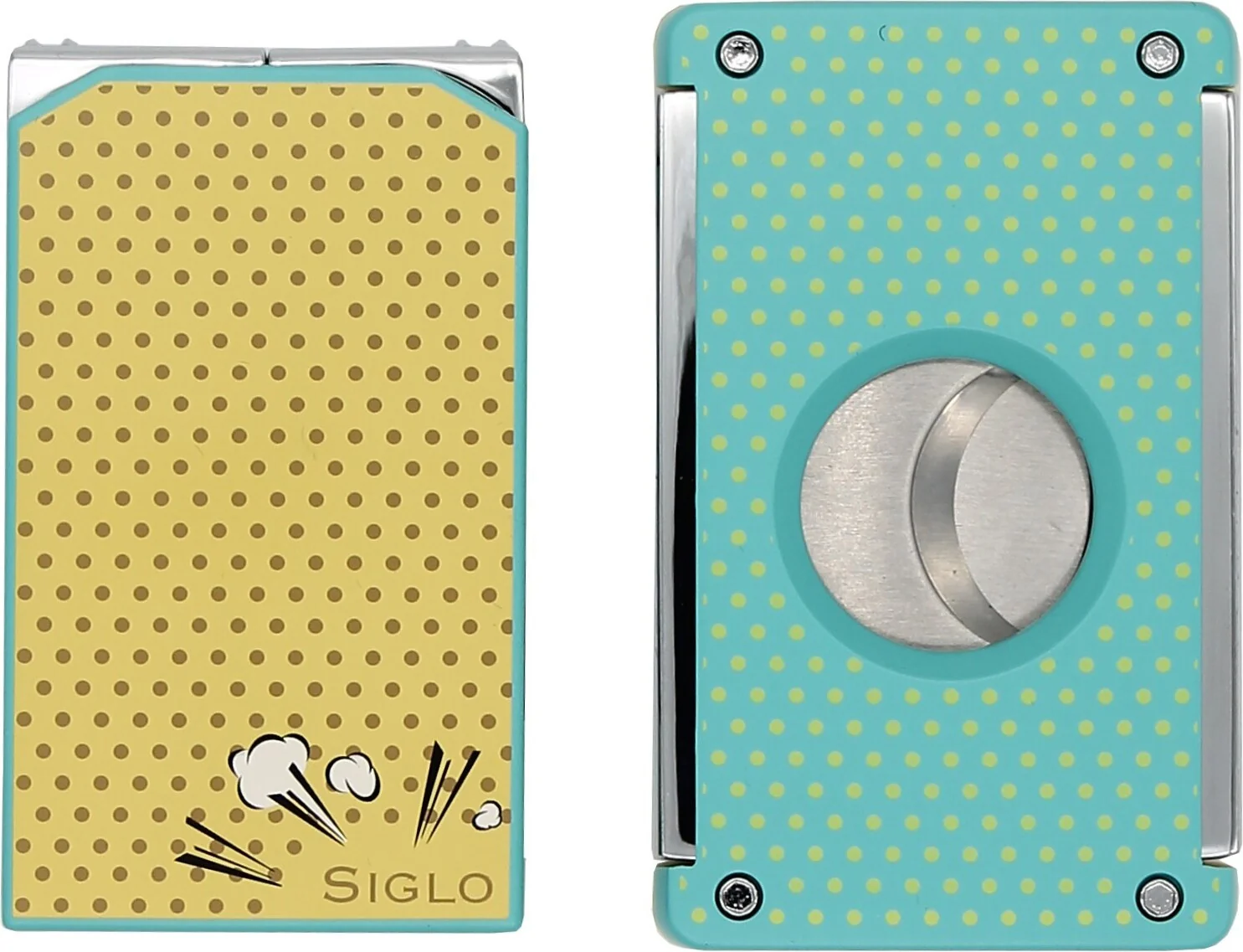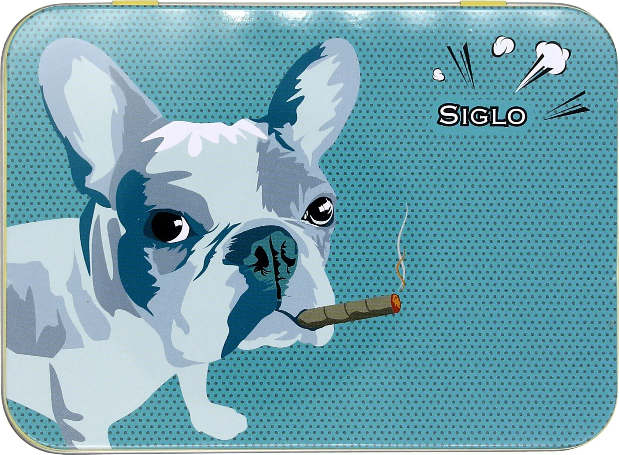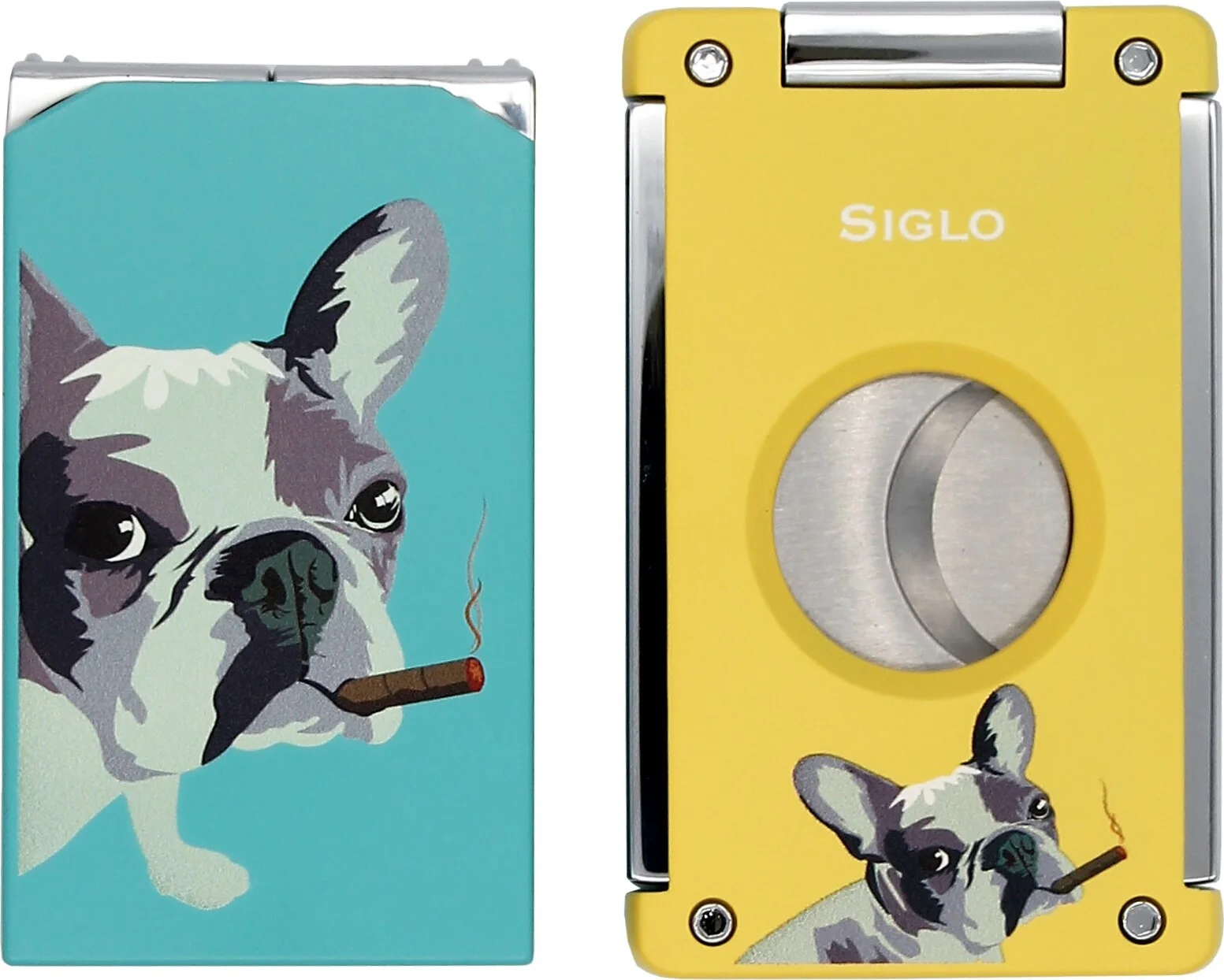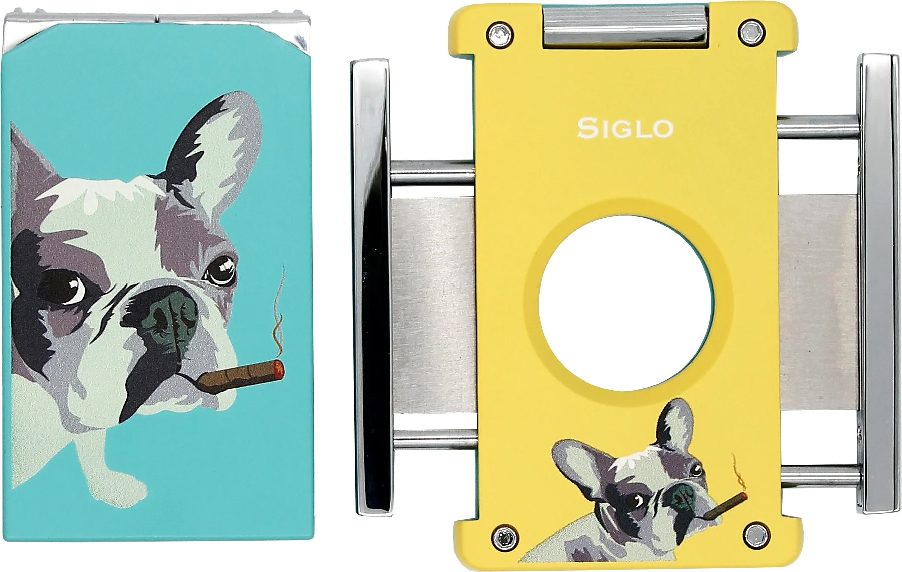 Zestaw zapalniczka i obcinacz do cygar Siglo Dog to efektowny i kreatywnie zaprojektowany duet dla miłośników cygar. Oba akcesoria przedstawiają palącego buldoga francuskiego w stylu pop-art. Tylne ścianki nawiązują do tego motywu typowym wzorem w kropki, podkreślając artystyczny charakter projektu. Zestaw natychmiast przyciąga wzrok i dodaje nowoczesnego, humorystycznego akcentu do każdej kolekcji cygar.